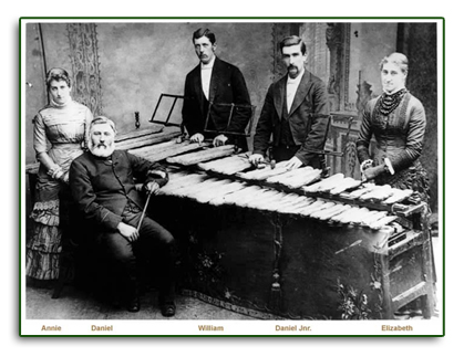 Nineteenth century woodwind maker Cornelius Ward patented a foot pedal for use on a Lithophone around 1850. The pedal was eventually put into use by Victorian era bands like the Till Family (pictured below) who literally named their group “The Till Family Rock Band”, named for the stones they used as notes on their Lithophone like instrument.