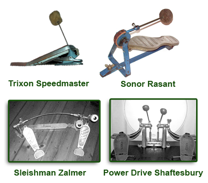 During the thirties and forties the evolution of the pedal seemed to level off. Aside from the 1937 creation of the Ludwig Speed King, the kick pedal remains virtually unchanged until the fifties when the Sonor drum company came up with its first cam driven by a leather strap called the Rasant. Alternately the same decade brought forth the first chain driven pedal called the Trixon Speedmaster. The seventies recharge an idea previously attempted fifty years earlier as the Sleishman, Zalmer Power Drive Shaftesbury twin pedals hit the market. Steve Gadd experiments with the Zalmer line of double kick pedals. The eighties and nineties bring about the popularity of double bass playing. During this time companies like Pearl, Tama, DW and Axis all release their own brand of twin pedal setups.