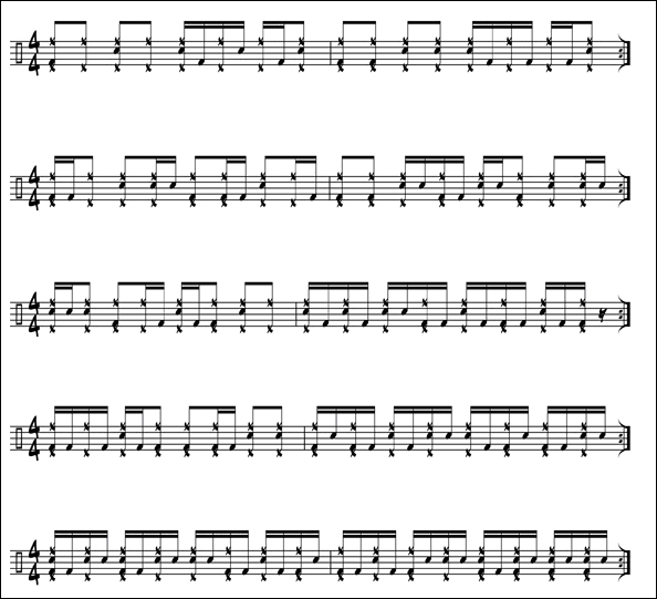 This is a fun concept I have been working on lately. I picked it up from watching NYC drummers like Keith Carlock and Zach Danziger play. They were able to keep time with the ride and hi-hat together and then comp between the bass and snare drum. This is a jazzy concept but in a rock, funk type setting. Once you develop the coordination and feel, you can create a lot of interesting variations and a train-like time flow. Try to make up your own variations by playing some rudiments between the snare and bass, or adding to the ride pattern. But make sure what you play always has a smooth time flow.