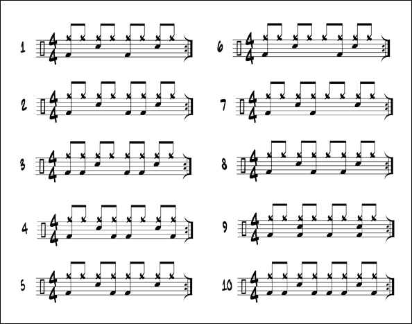 I decided to throw a curveball out here. You can easily say “I can play these” and ignore the lesson here, or you can take the challenge and see what you can do with them. Almost every drummer has a hard time laying back. First, you have to want to lay back. I play in a lot of groups, and I wouldn’t be able to pay my bills if I did not enjoy putting my all into making these grooves feel good. Try to play each one for a couple minutes straight without budging. Try to swing each one. Then try to groove on each one and slowly start to embellish on it. Be true to the challenge because you will only be hurting yourself. I can name hundreds of songs that use these drum beats and take almost any complete pattern and break it down to one of these. Think of this as your foundation in drumming. Enjoy this exercise. It is what you make of it. All of the true masters of the drum set have a mastery of the basics.