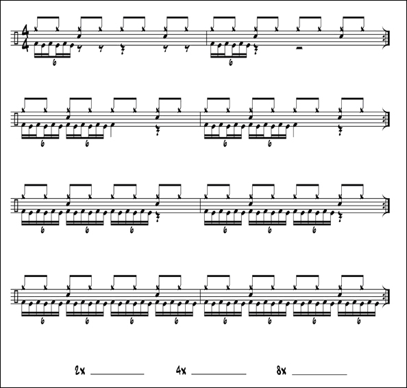 I hope everyone’s legs are feeling good after Part 1 of this lesson Double Bass Building Blocks – Part 1. If you are practicing this stuff you should be noticing some great results by now. Here is another building block using 1/16 note triplets. Once again, start slow and try one line at a time. Once you are comfortable, play the whole exercise. Keep track of your times so you can notice improvement and push yourself to the next level. Have fun!