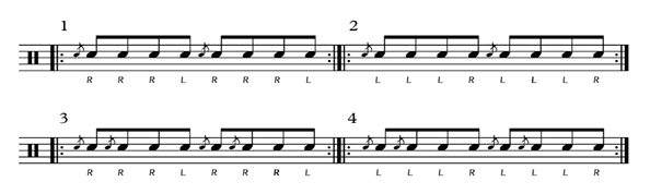 Always start slow and play each exercise several times before proceeding to the next. Don’t forget to perform this and all rudimental exercises at soft, medium and loud volumes.
