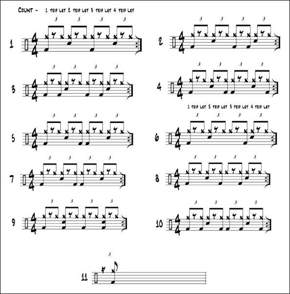 In this visit back to basics, I took the grooves from Part 1 and now play them as a shuffle. Personally I feel shuffles aren’t understood enough by younger generations and are very important in developing one’s feel. The most important thing is to pulsate triplets when you’re playing these grooves. Try not to straighten them out. Remember, in a shuffle, the hi-hat plays on the first and third note of the triplet. Try to find some songs that use these grooves to better understand them. Many can be found in Stevie Ray Vaughn tunes with Chris Layton on drums.