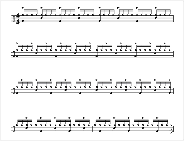 This exercise is a fun one. You can use the displacements of accents to imply a modulated time. You will start out by accenting the downbeat. Then you will start to accent every third hi-hat. Eventually you will start to imply the modulation by playing the bass and snare along with accents. Make sure you always feel the downbeat pulse. Use a metronome to help you out. You can use tools like this to change moods or play tricks on listening ears. This will also help your time and your ear. You can experiment with different groupings to imply different times.