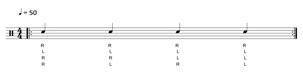 The exercise below is an excerpt from my upcoming book, Stick it to Your Chops. I call it the “90° Bounce.” It is the absolute first thing I play and I use it religiously. It is most effective when played very slowly. The downstroke should be strong, allowing for more bounce. Both sticks should come up to equal heights, approximately 90 degrees and arms should remain parallel to the floor. Play each line several times before proceeding to the next and observe the metronome mark. I strongly suggest using a metronome and following the metronome marking.