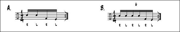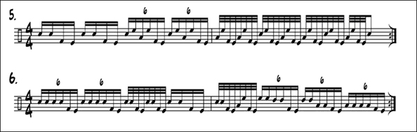 Here are two common double bass licks. The first one is the classic two with the hands, two with the feet. The second is four with the hands, two with the feet, phrased as 1/16 notes. Each of these licks can be played and phrased numerous ways. Get comfortable playing each lick clean and smooth. Then move it around the kit. When you practice the fills make sure you alternate keeping time with the fill. Try to make 4- or 8-bar loops.